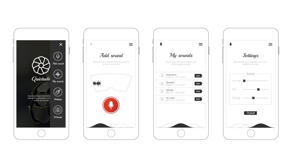 The accessories detect sounds and translate them into shape changes, light patterns and vibrations. Wearing the accessories, the deaf persons can perceive sounds through the body. Quietude addresses a number of needs of people with hearing impairment, from functional needs like ambient awareness, to hedonic needs like aesthetics.