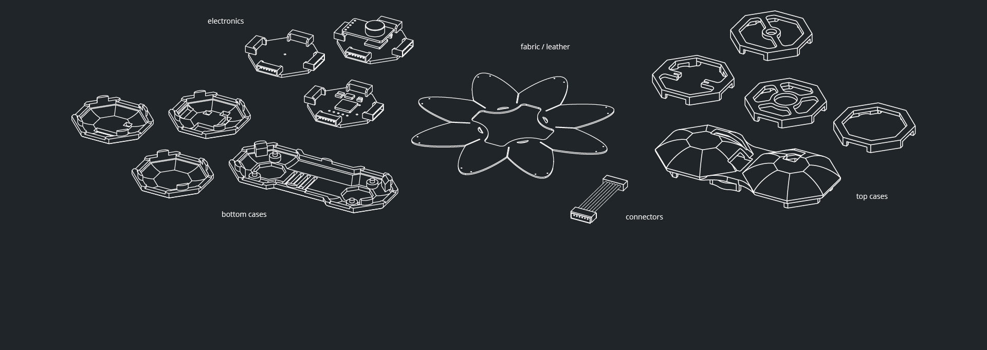 The suite of accessories is a modular system of interactive jewellery which can be configured in different forms and on-body use. Materials include fabrics, leather, felt and recycled plastic in combination with CAD/CAM, 3D printing, laser cut and engraving.